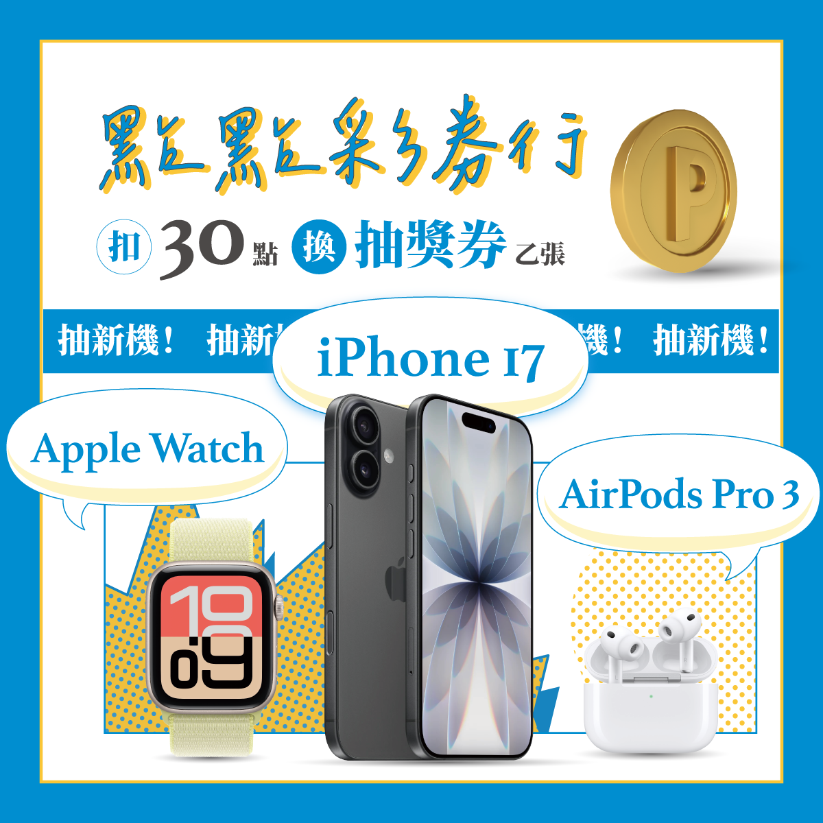 活動期間會員於三創生活PLUS APP扣30點換「抽獎券」乙張,抽iPhone 17(乙名/價值29,900元)、Apple Watch SE 3(乙名/價值7,900元)、AirPods Pro 3(乙名/價值7,490元)。
