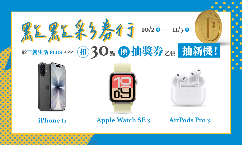 活動期間會員於三創生活PLUS APP扣30點換「抽獎券」乙張,抽iPhone 17(乙名/價值29,900元)、Apple Watch SE 3(乙名/價值7,900元)、AirPods Pro 3(乙名/價值7,490元)。