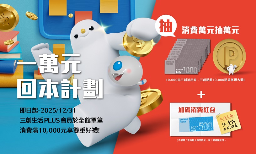 活動期間 三創生活PLUS會員 於全館單筆消費滿10,000元 贈抽獎券乙張(滿20,000元贈兩張,以此類推)有機會抽中10,000元三創抵用券、三創點數10,000點……等多項大獎