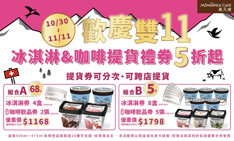 - 【組合A】冰淇淋4盒+咖啡飲品券2張|優惠價$1,168(價值$1,726)