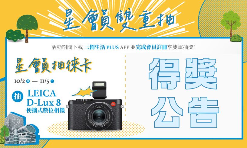 2025/10/02(四)-2025/11/05(三) 於活動期間下載「三創生活PLUS」APP並完成會員註冊抽LEICA D-Lux 8 便攜式數位相機/乙台(價值58,500元)。以下為得獎者名單,恭喜得獎者!請於11/20(四)-12/21(日)期間至2F顧客服務中心領取獎品。