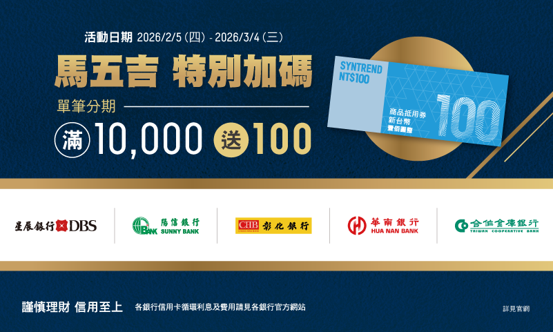 單筆分期滿10,000加贈100