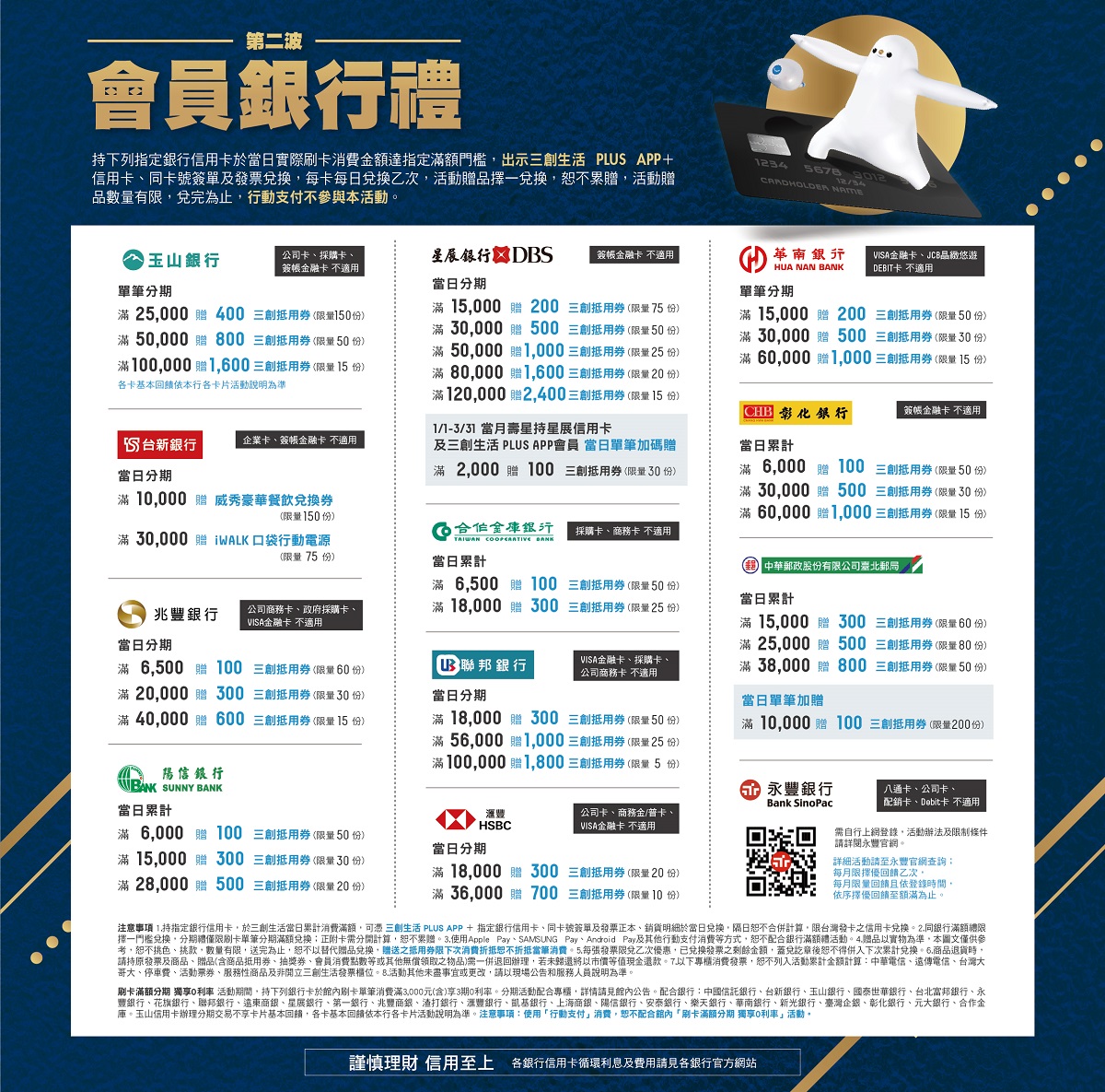 持下列指定銀行信用卡於當日實際刷卡消費金額達指定滿額門檻,持三創生活PLUS APP+信用卡、同卡號簽單及發票兌換,每卡每日兌換乙次,活動贈品擇一兌換,恕不累贈,各銀行各門檻活動贈品數量有限,兌完為止,行動支付不參與本活動。