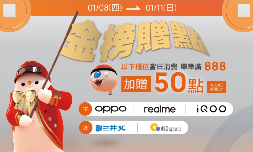 1/8(四) - 1/11(日)活動期間以下櫃位當日消費 單筆滿888 加贈50點!