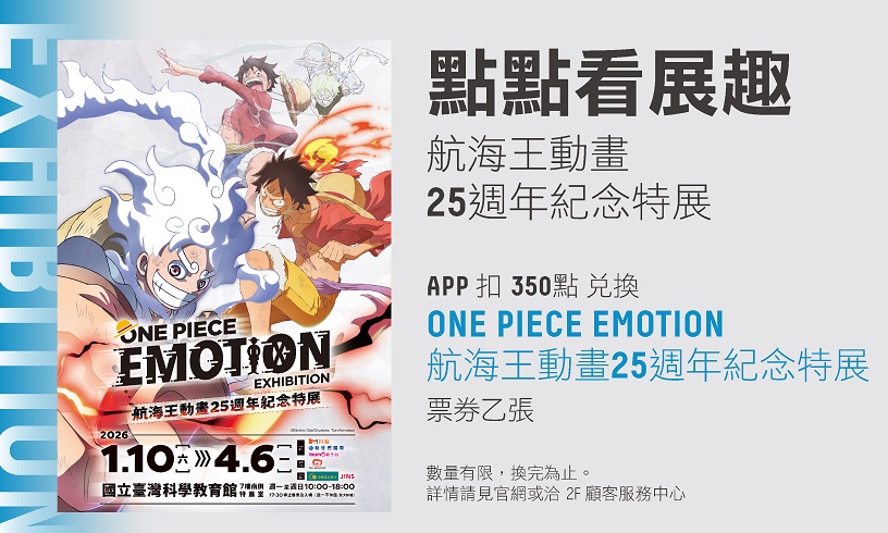 會員於三創生活PLUS APP內 扣350點 即可兌換「ONE PIECE EMOTION 航海王動畫25週年紀念特展」貴賓券 乙張 (數量有限,換完為止)