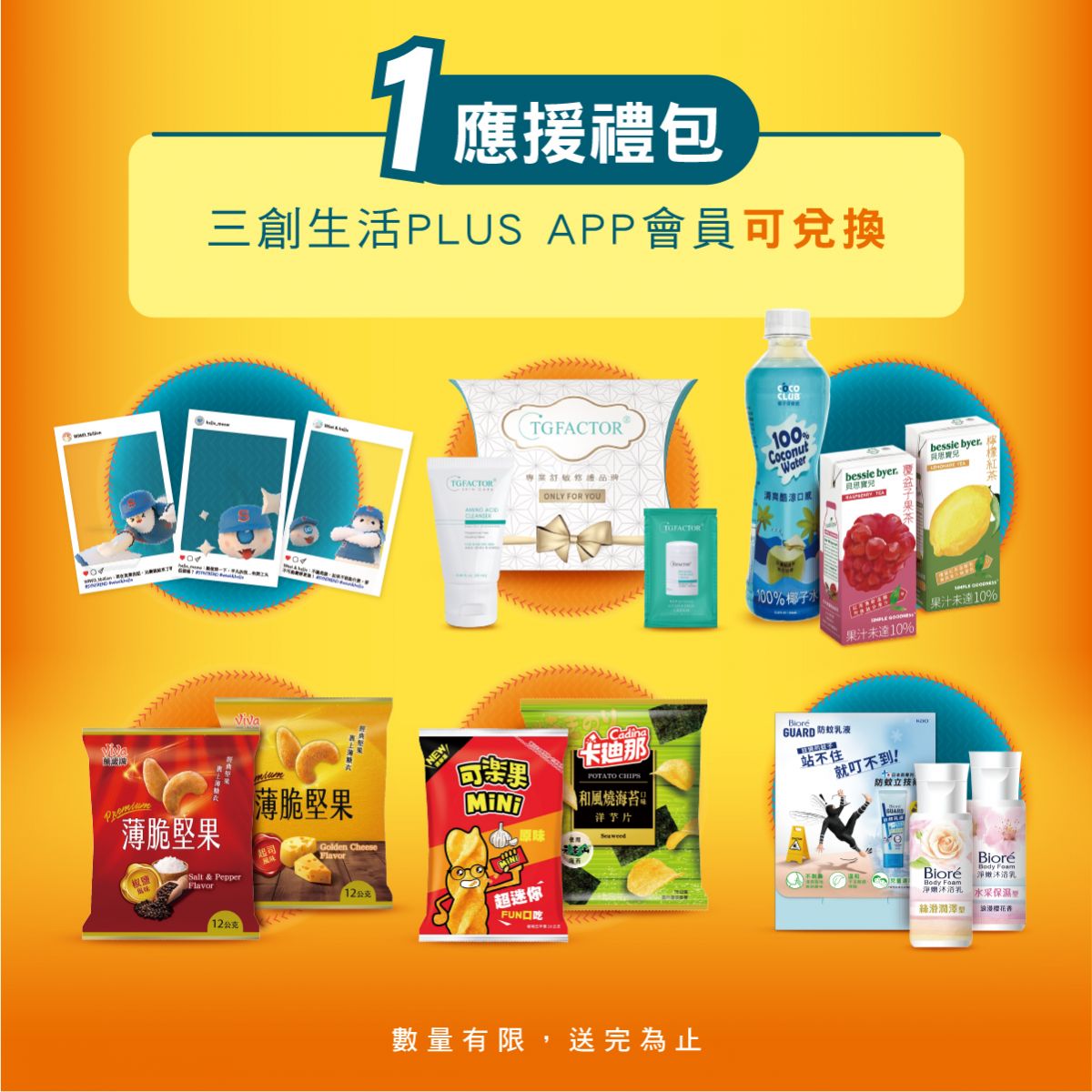 出示三創生活PLUS APP之會員QRC可免費兌換乙份,每日不同款球迷透卡+各項應援禮。