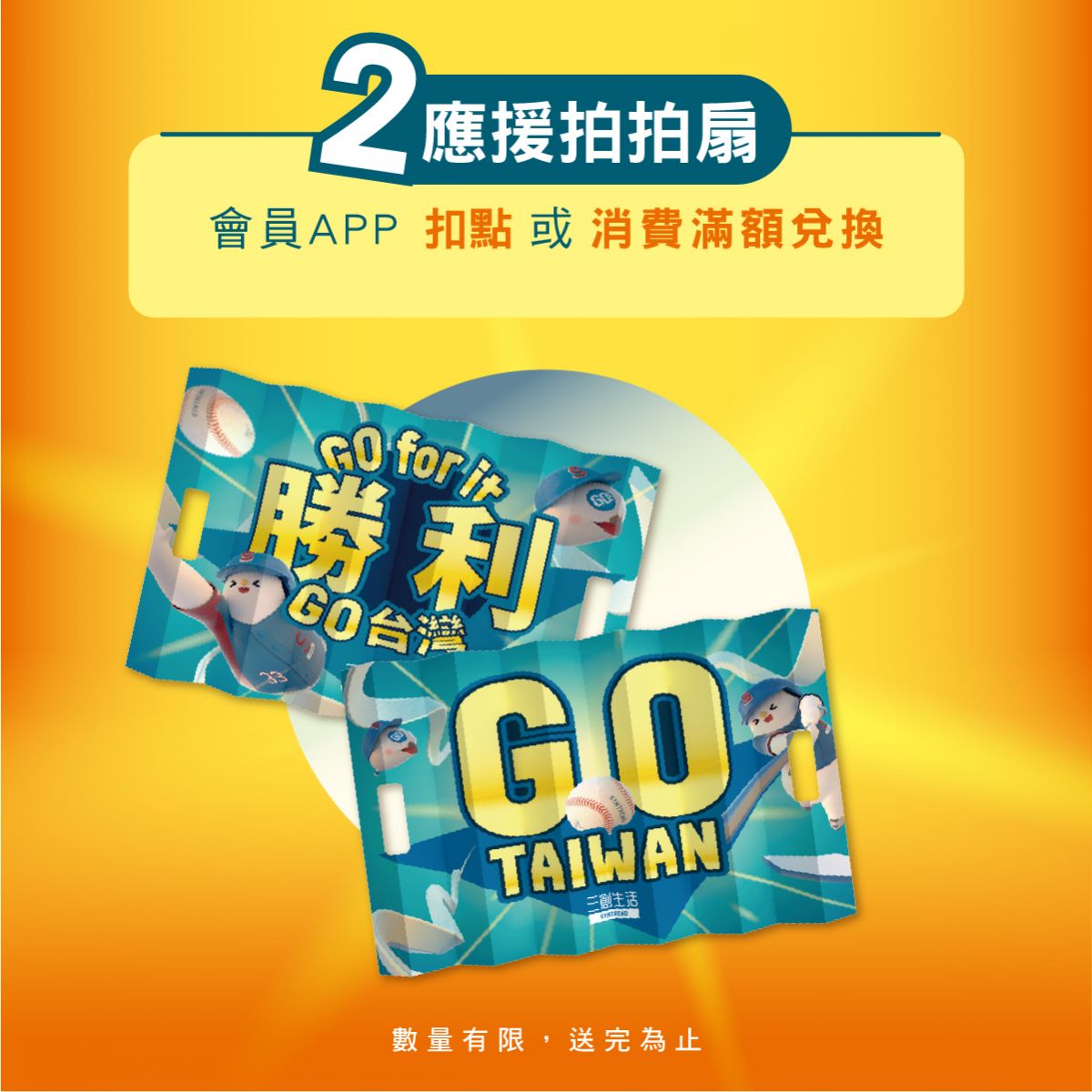 1.應援禮包和應援拍拍扇(限金銀星),每人每日限兌換乙份,恕不接受代換或一人多帳號兌換。 2.贈品數量有限換完為止,兌換完畢於現場公告,將不另行通知。 3.會員點數經扣除兌換後恕不退還點數。 4.贈品圖片僅供參考,以現場實物為主。 5.中華電信、台灣大哥大、遠傳電信、停車費、活動票券、服務性商品及非開立三創生活發票恕不受理兌換。 6.其他未盡事宜以現場公告與人員說明為準,三創生活保有活動最終解釋權。