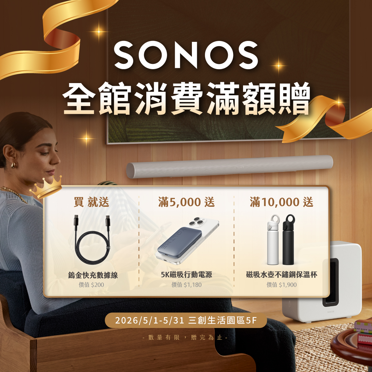 SONOS新櫃登場!5/1–5/31 全館消費滿額贈
