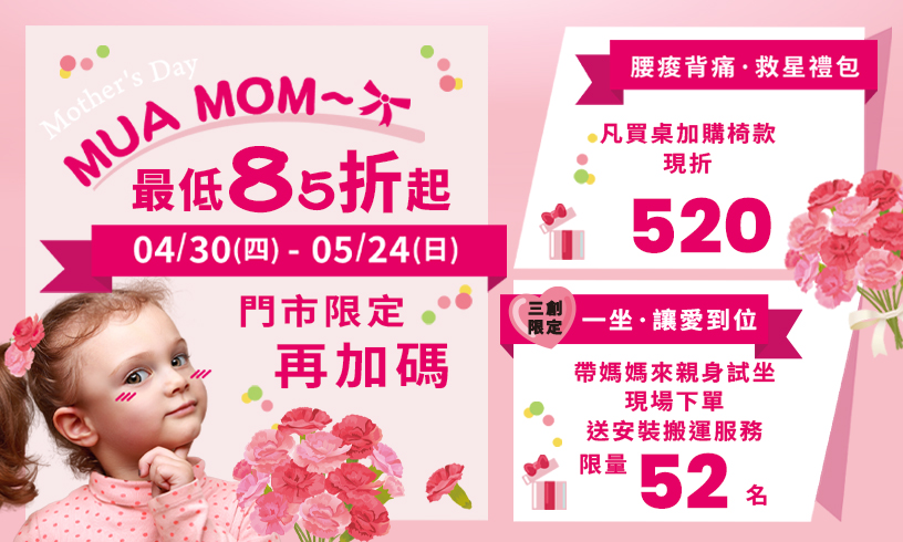 帶媽媽來試坐指定椅款,再加碼送 安裝搬運服務(限量52名)