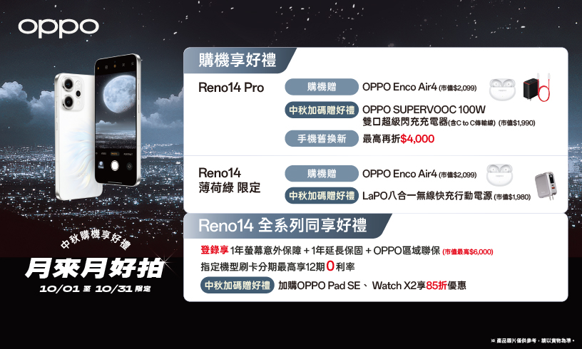 今年中秋烤肉聚會,讓新機陪你拍出最圓滿的回憶!購買指定機型即享限定加碼禮,先換先享!即日起-2025/10/31前,至OPPO體驗店享超值優惠,快手刀至最近的體驗店門市了解更多吧~