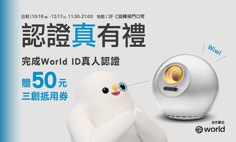 下載三創生活PLUS APP並註冊會員至3F活動指定地點,完成World ID數位認證,即可獲得50元三創抵用券乙份。(不限量,每會員每人期間限換一份)