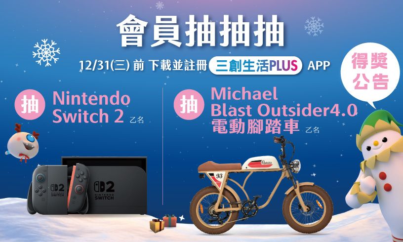 12/31(三) 前,下載並註冊 三創生活PLUS APP 抽「Nintendo Switch 2」(乙名)(市價14,380元),三創再加碼!Michael Blast Outsider4.0電動腳踏車(乙名)(市價69,800)