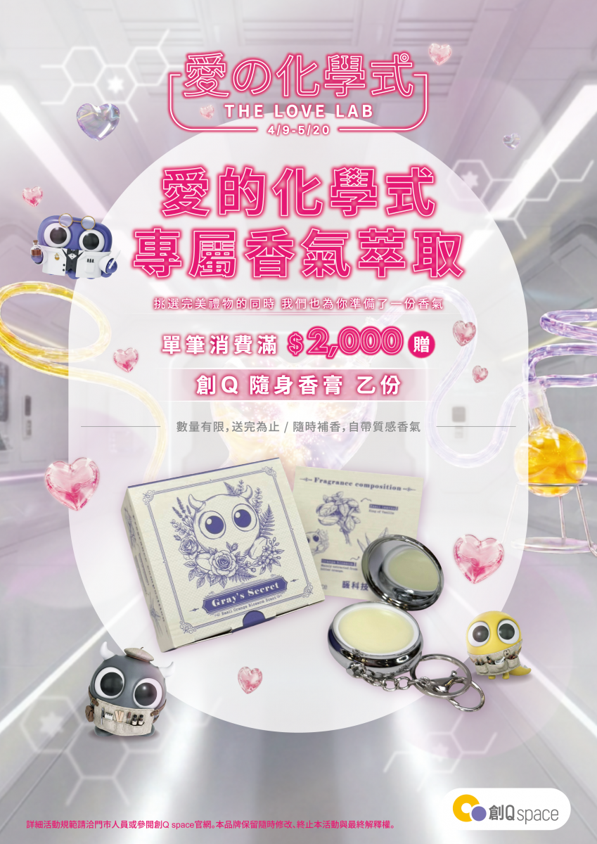於創Q space 專櫃結帳,單筆消費滿 $2,000 即可獲贈 【創Q 獨家隨身香膏】 乙份。(限量贈送,送完為止)